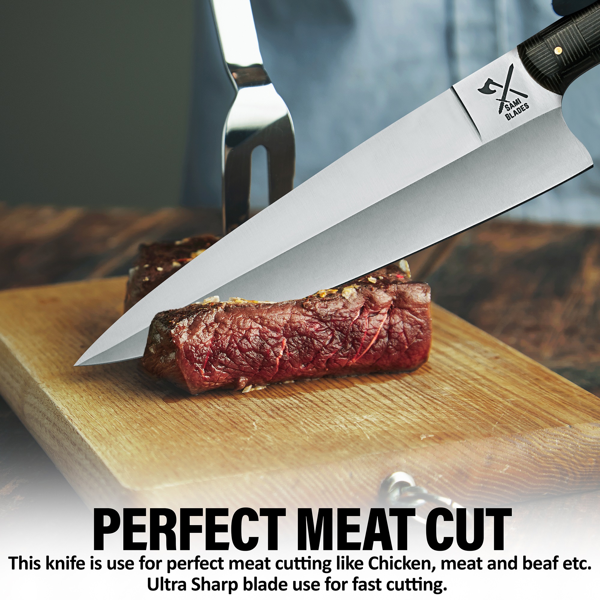 Sami Blades premium stainless steel chef knife have a 5 inches handle which is made from Micarta, a material known for its durability, water resistance and superior grip. The user friendly design make sure comfortable, fatigue free cutting. With its balanced manufacturing, this stainless steel chef’s knife for cooking becomes a necessary addition of your hand.