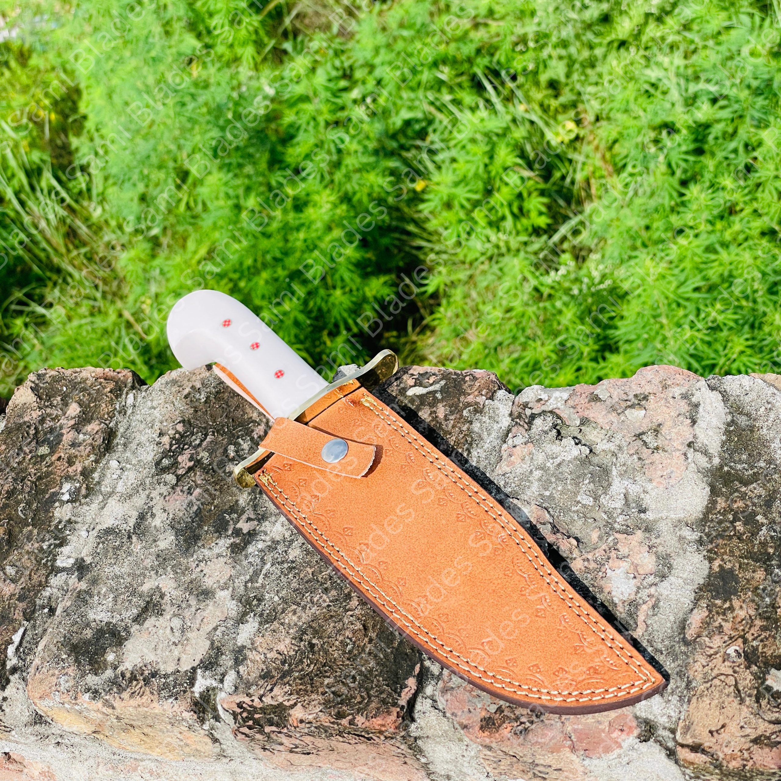 Introducing our custom fixed blade hunting knife with sheath, a premium handmade tool crafted for outdoor enthusiasts, collectors, and survivalists alike. This knife features a 7-inch high carbon custom blade polished to a mirror finish, offering exceptional strength and edge retention. Paired with a 5-inch resin handle, this knife ensures a secure and comfortable grip, making it ideal for long-term use in any condition.